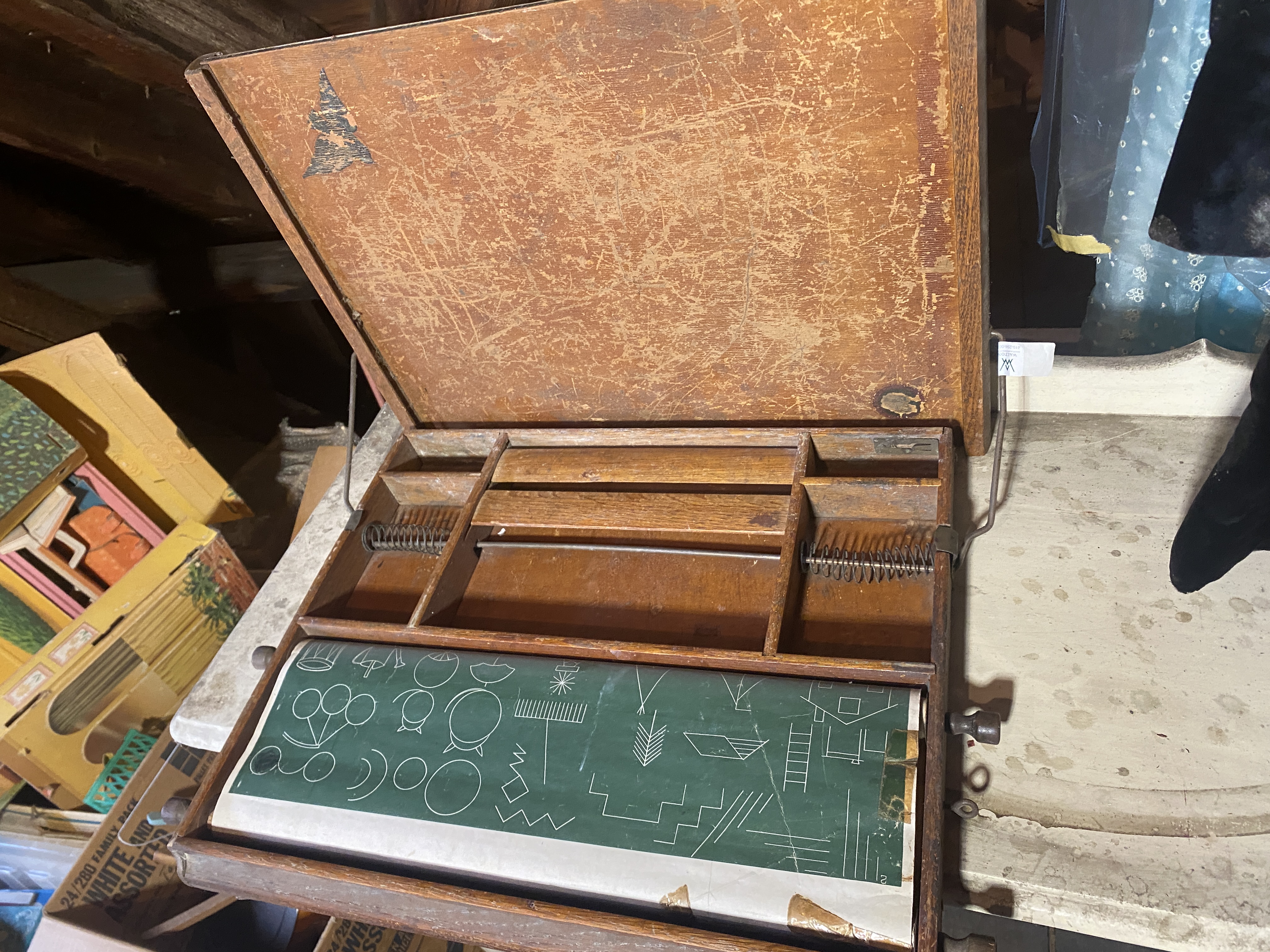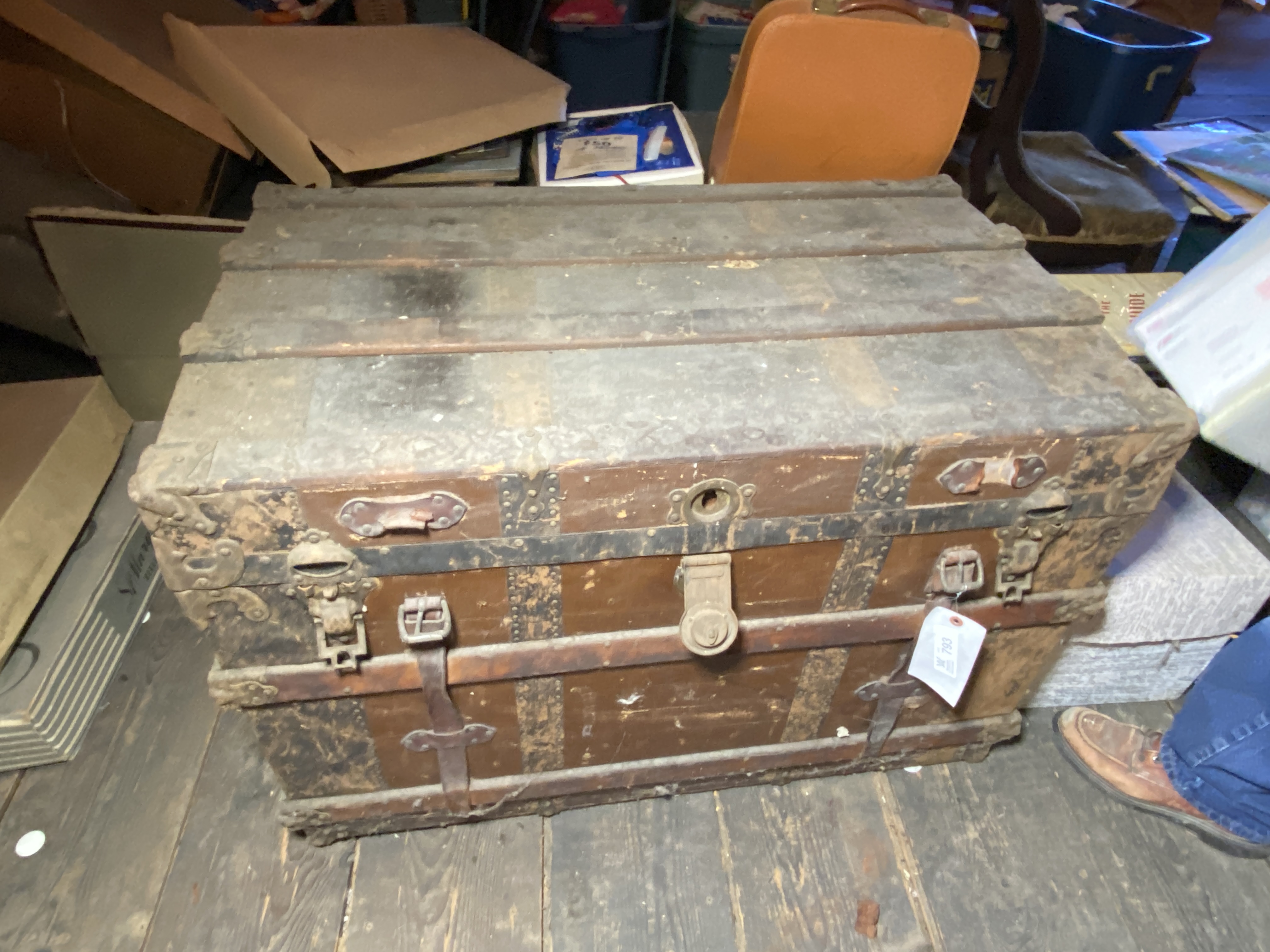 24”x13.5”x17.5”; old trunk w/contents (vintage games); chair & fainting