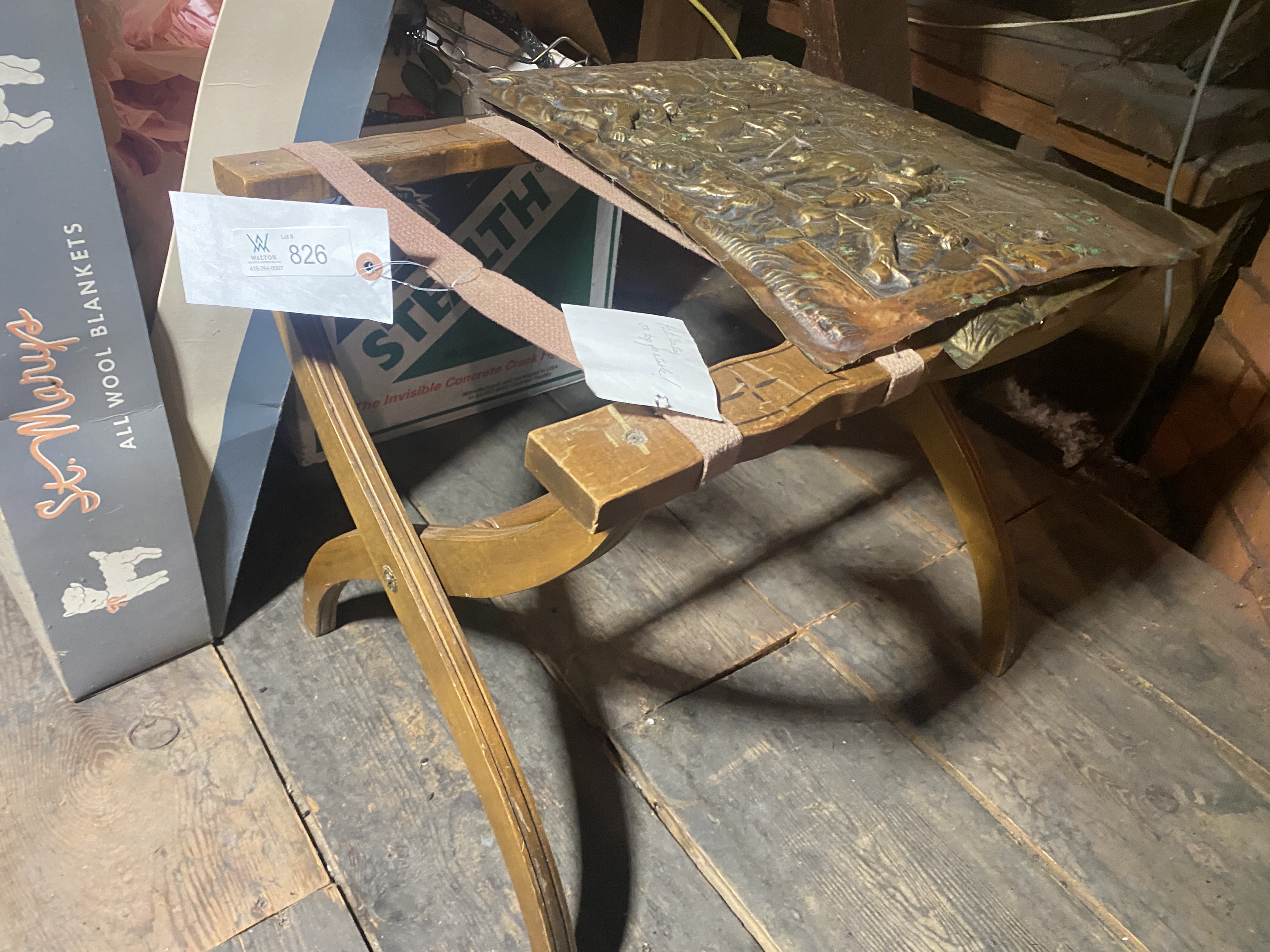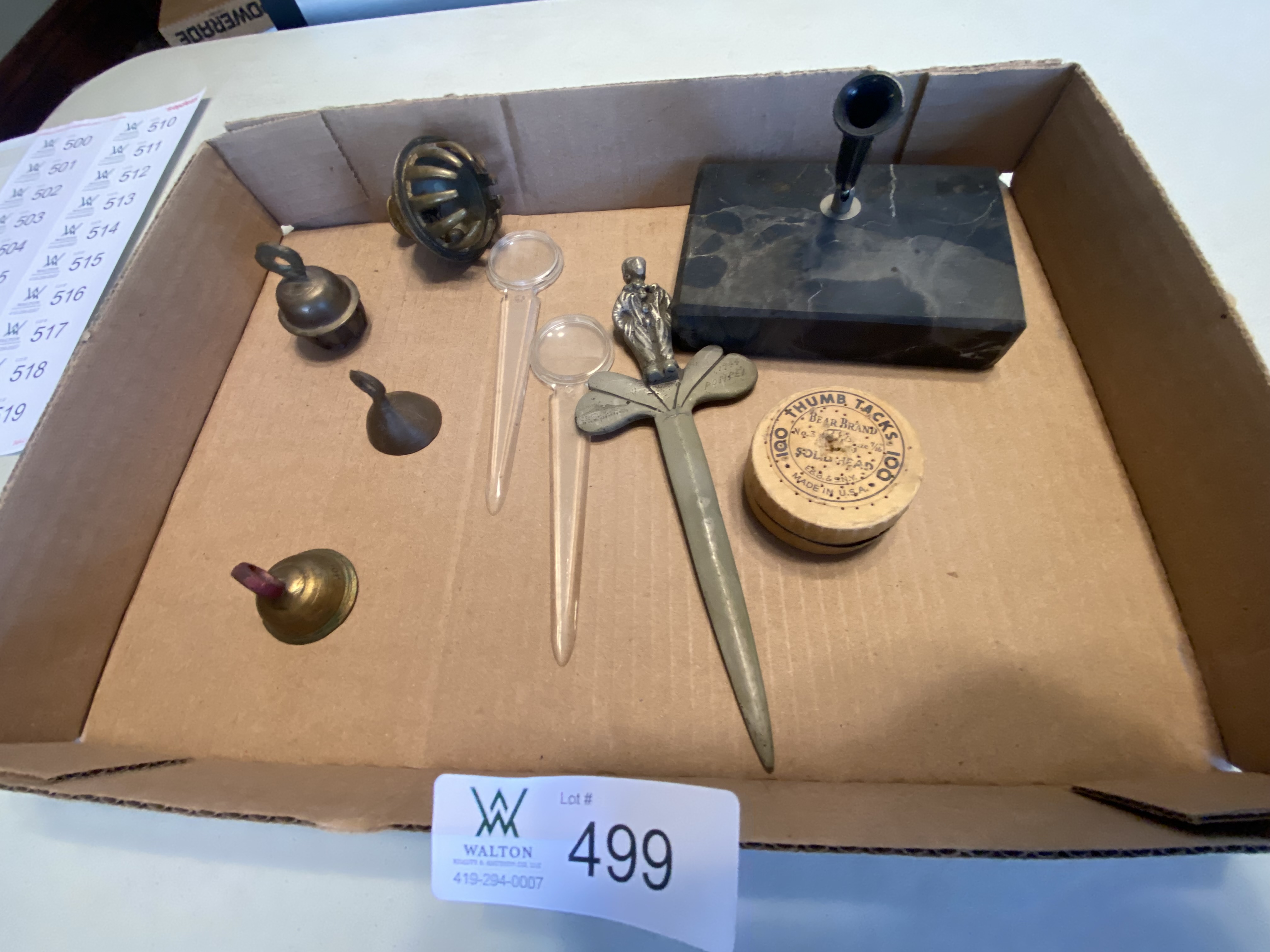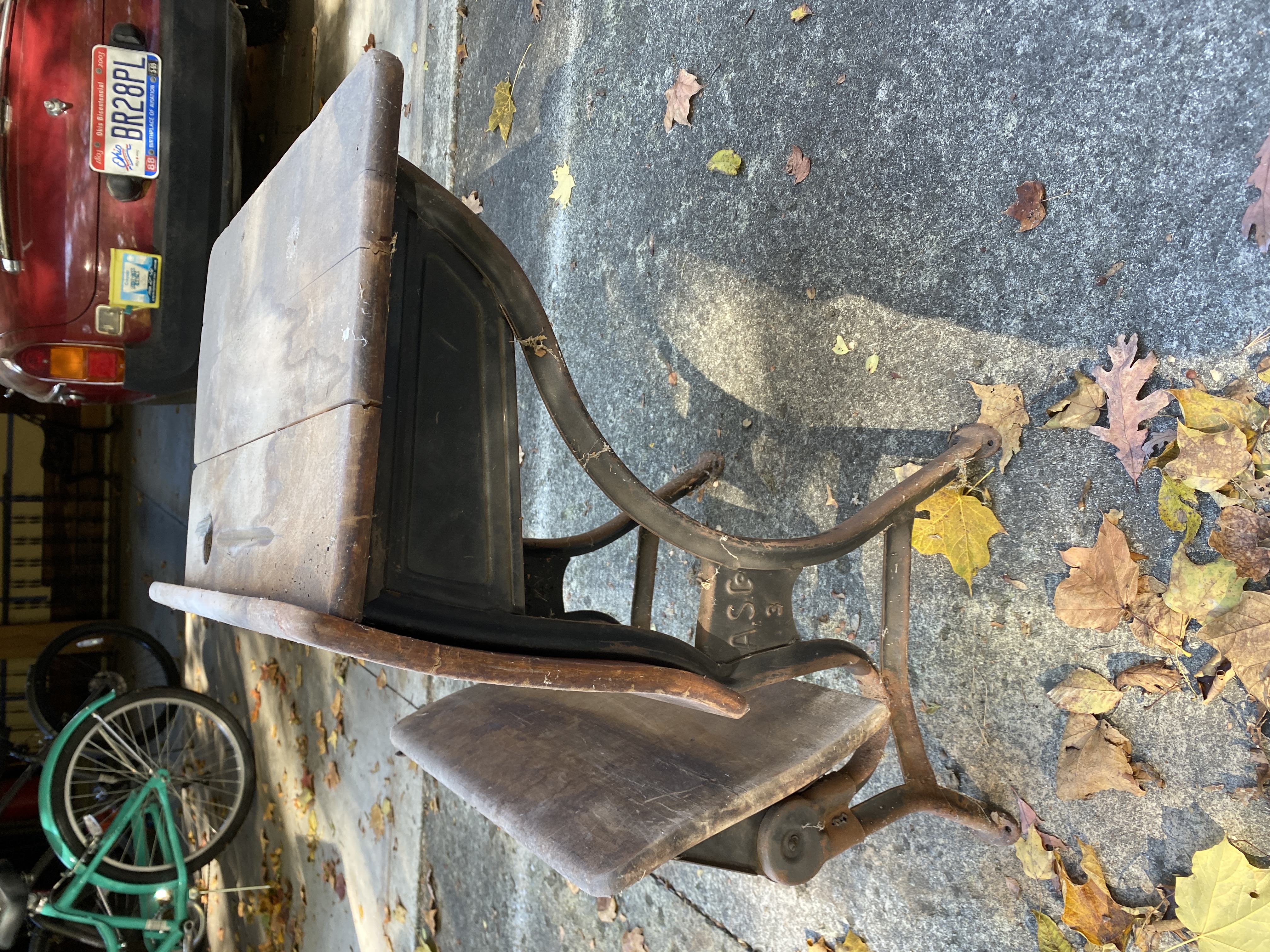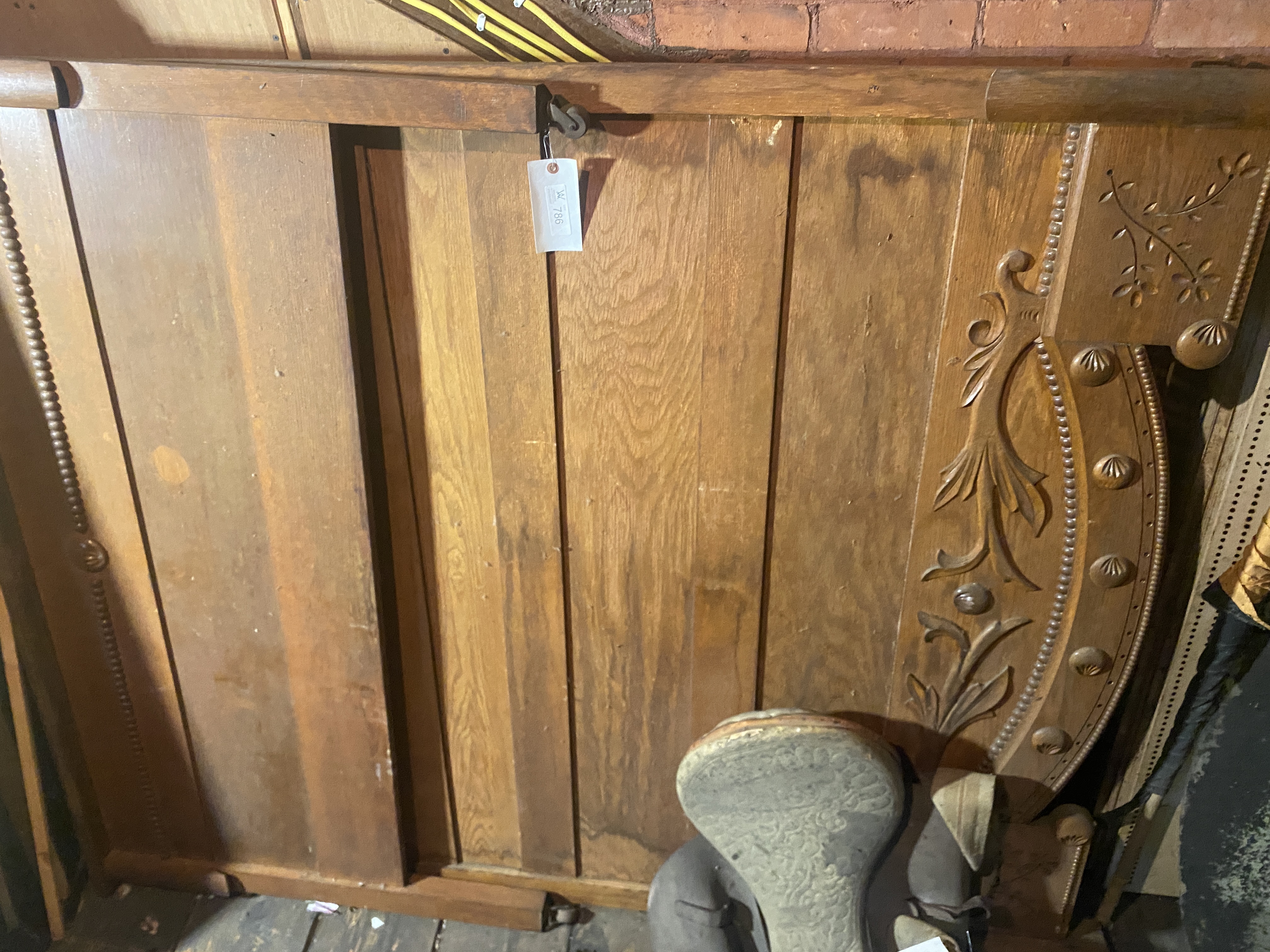 full size brass bed; wd. school desk; shaving mirror; quarter sawn oak table;