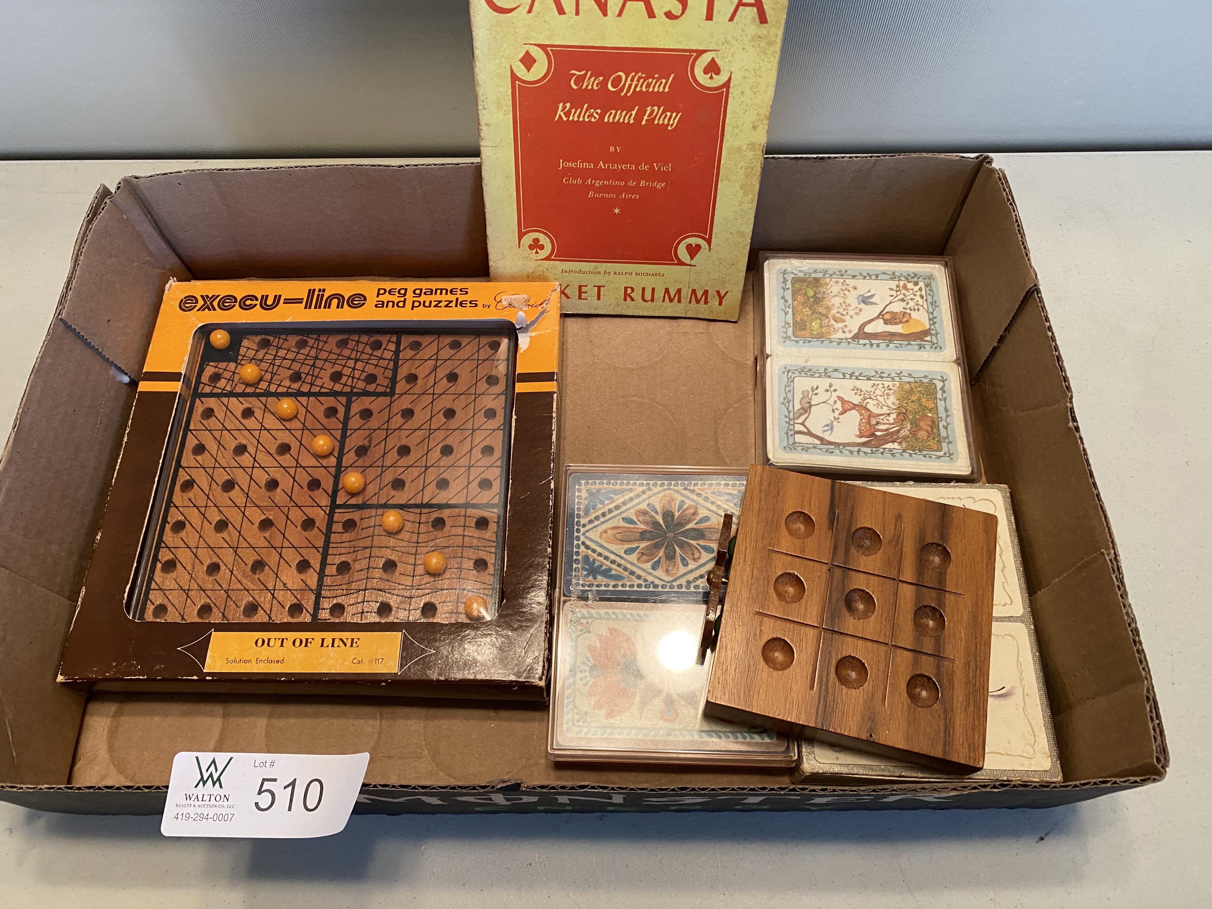 board games; Canada Dry ginger ale wood box; wash tub & stool.