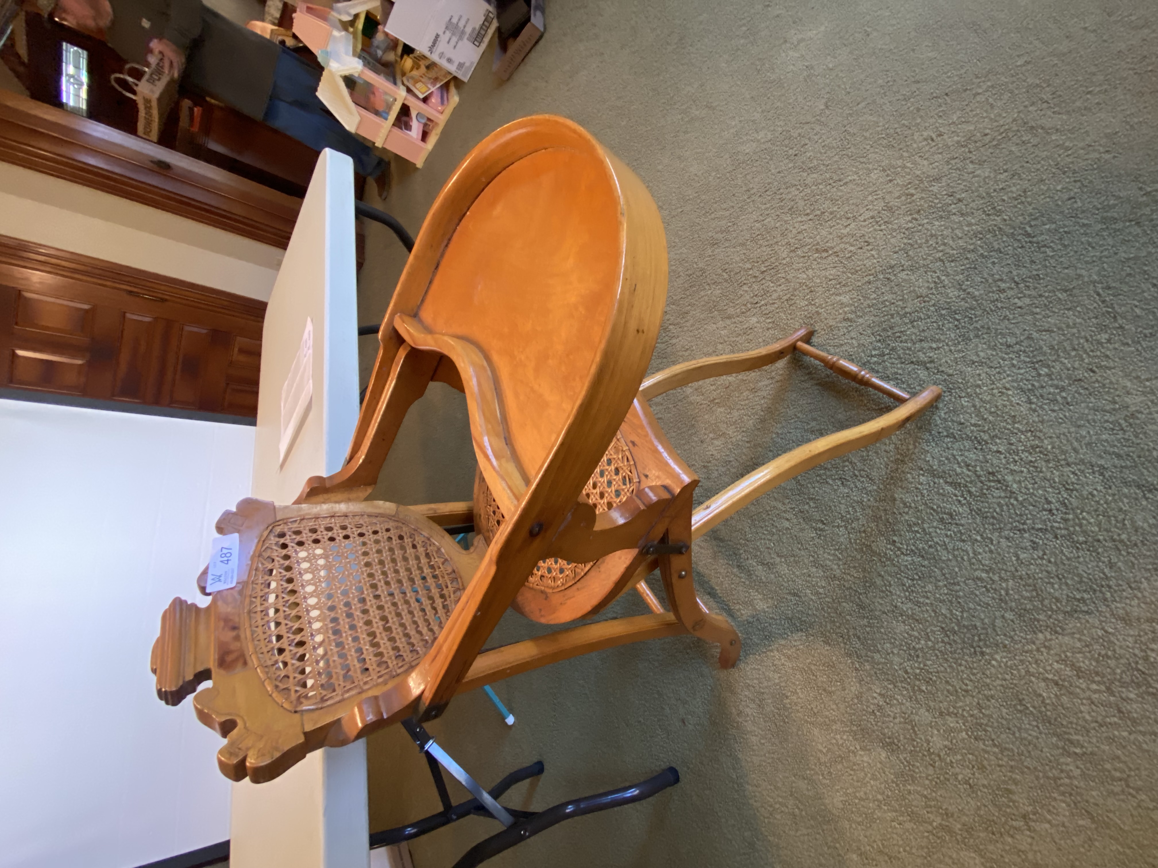 carved walnut chair; child’s rocker; umbrella stand; drying rack; dresser &
