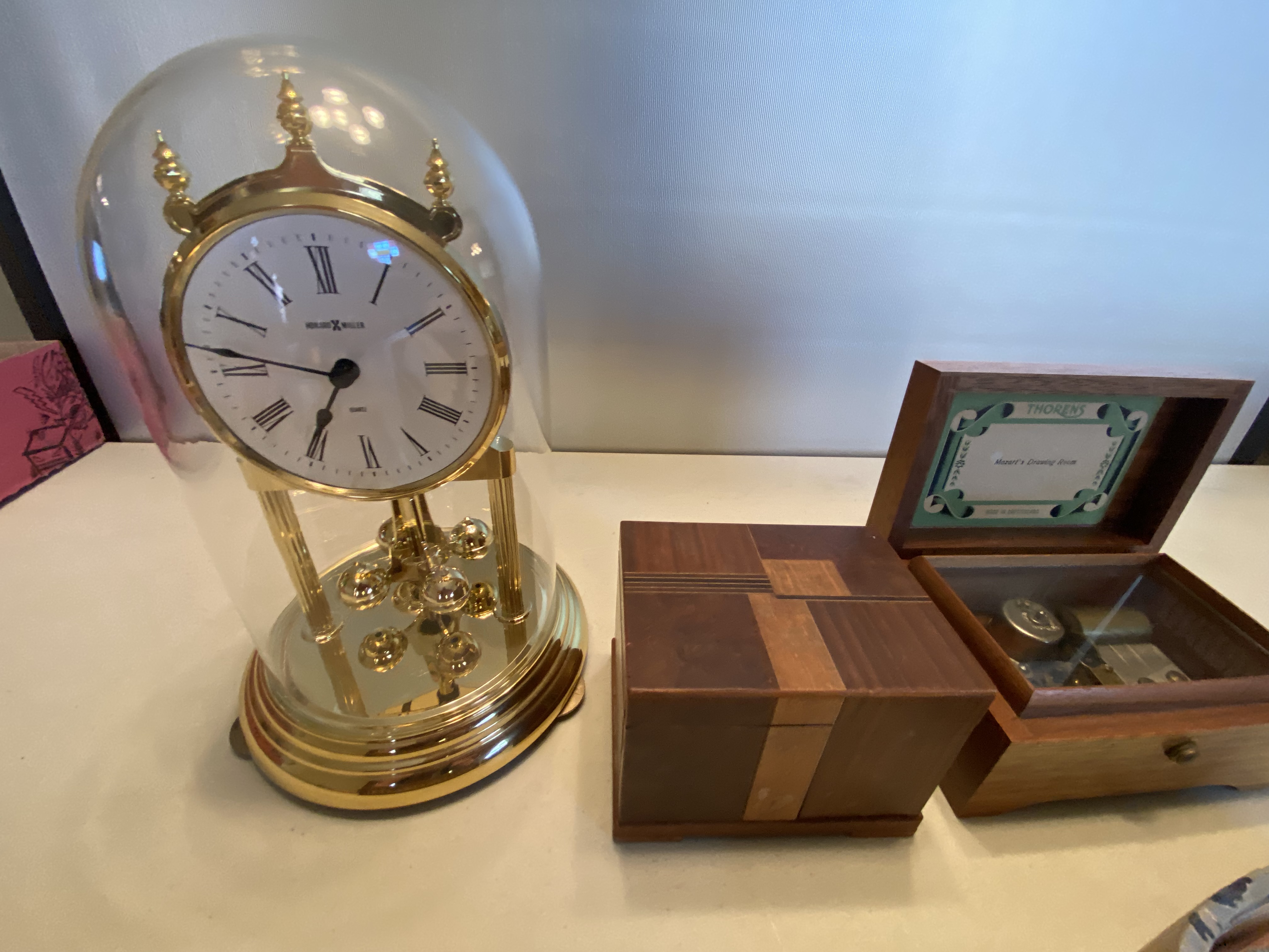 table, Gilbert mantel clock; vintage clothing; Murphy bed; pair of brown wicker