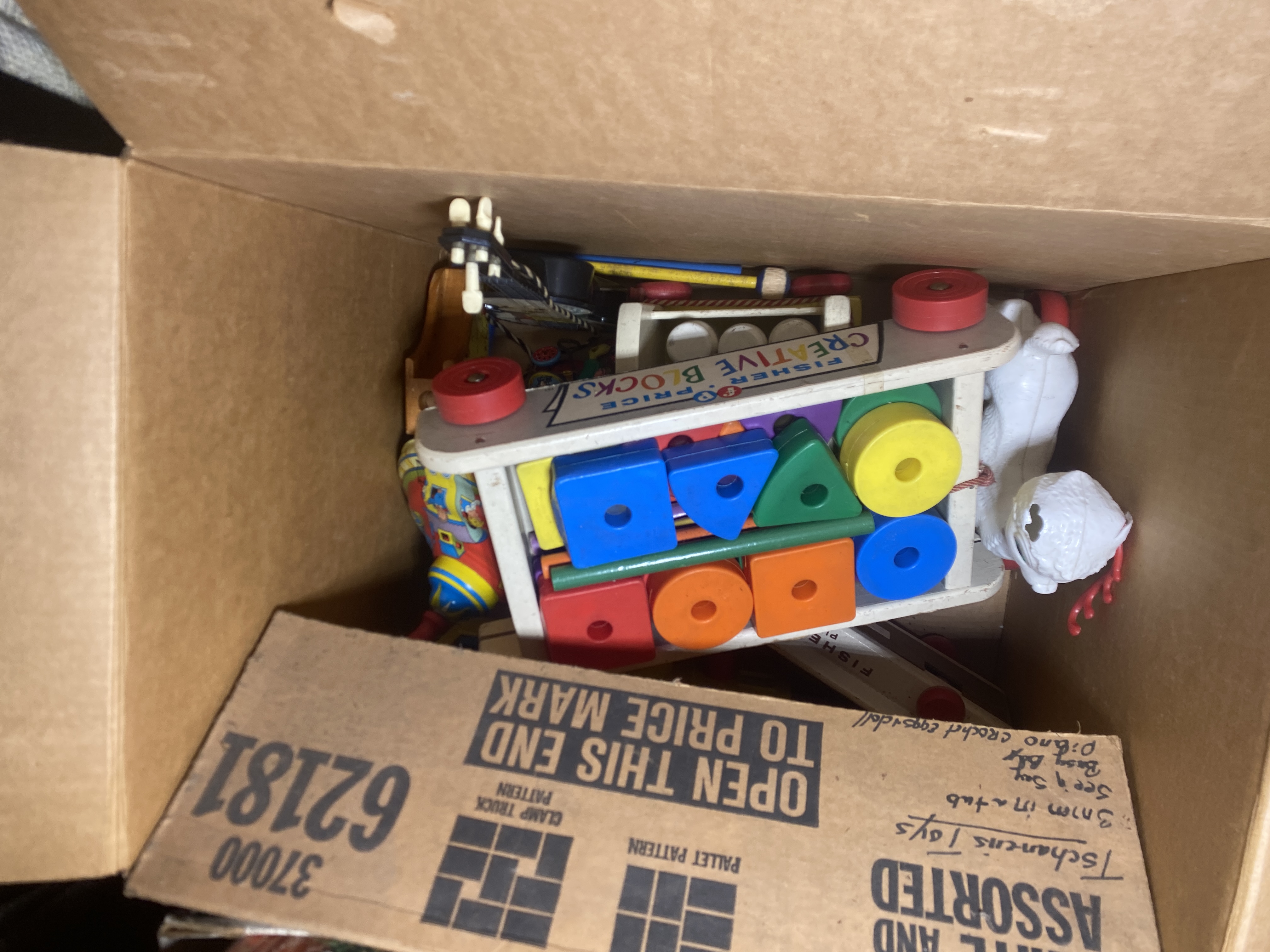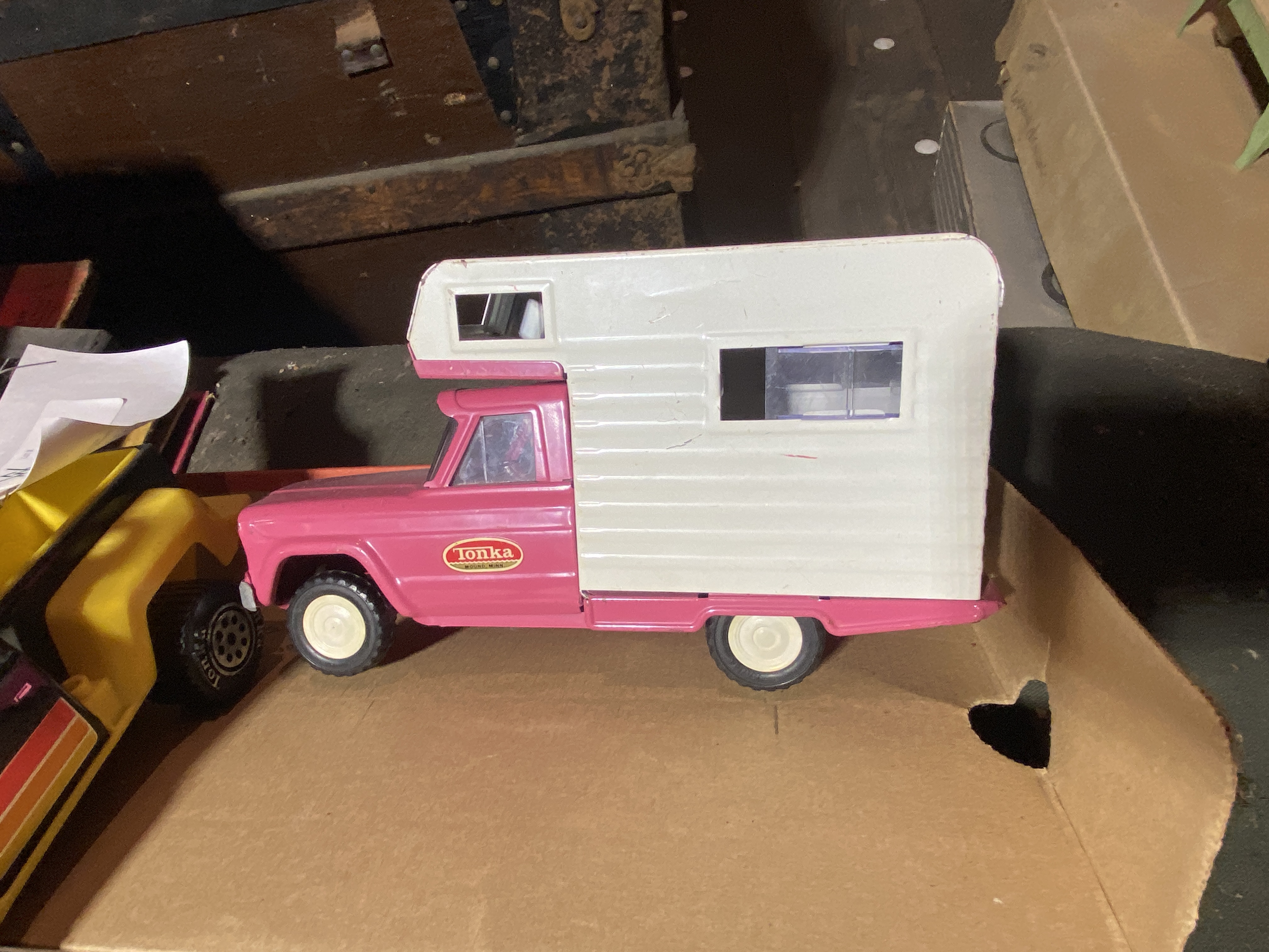 clothes; misc. boxes of books (cookbooks, Ohio, Old, etc.); Tonka toys, Hot