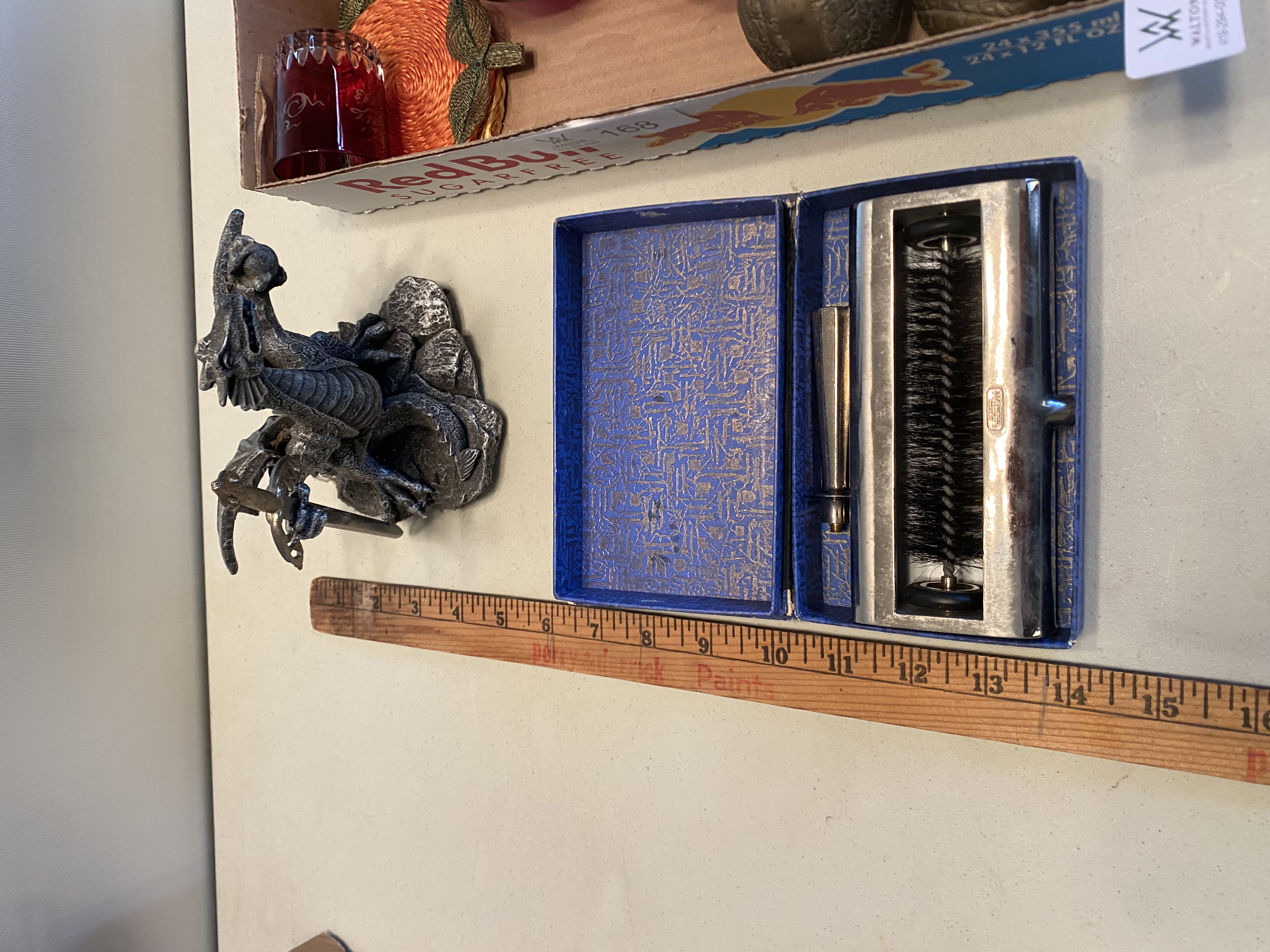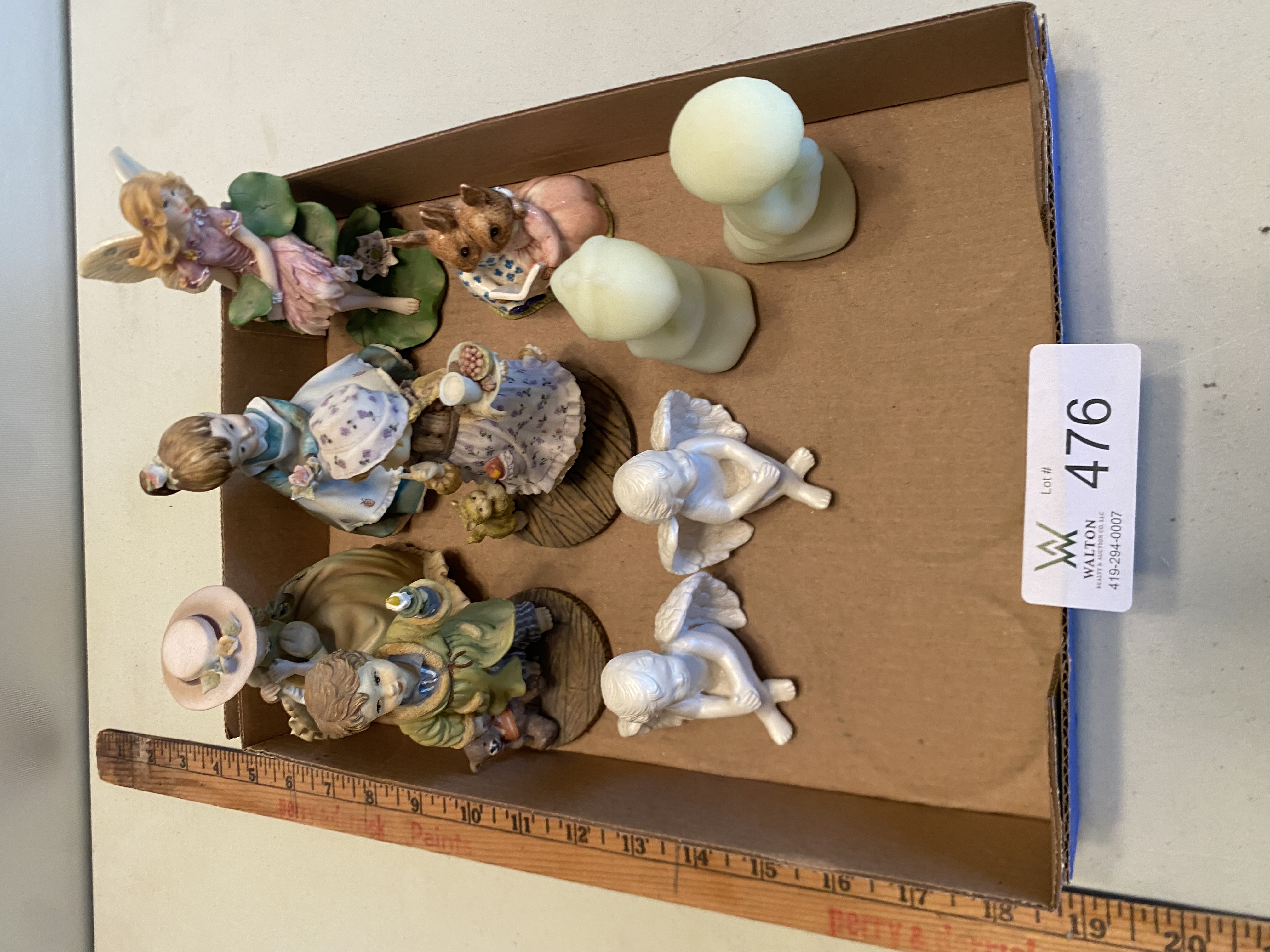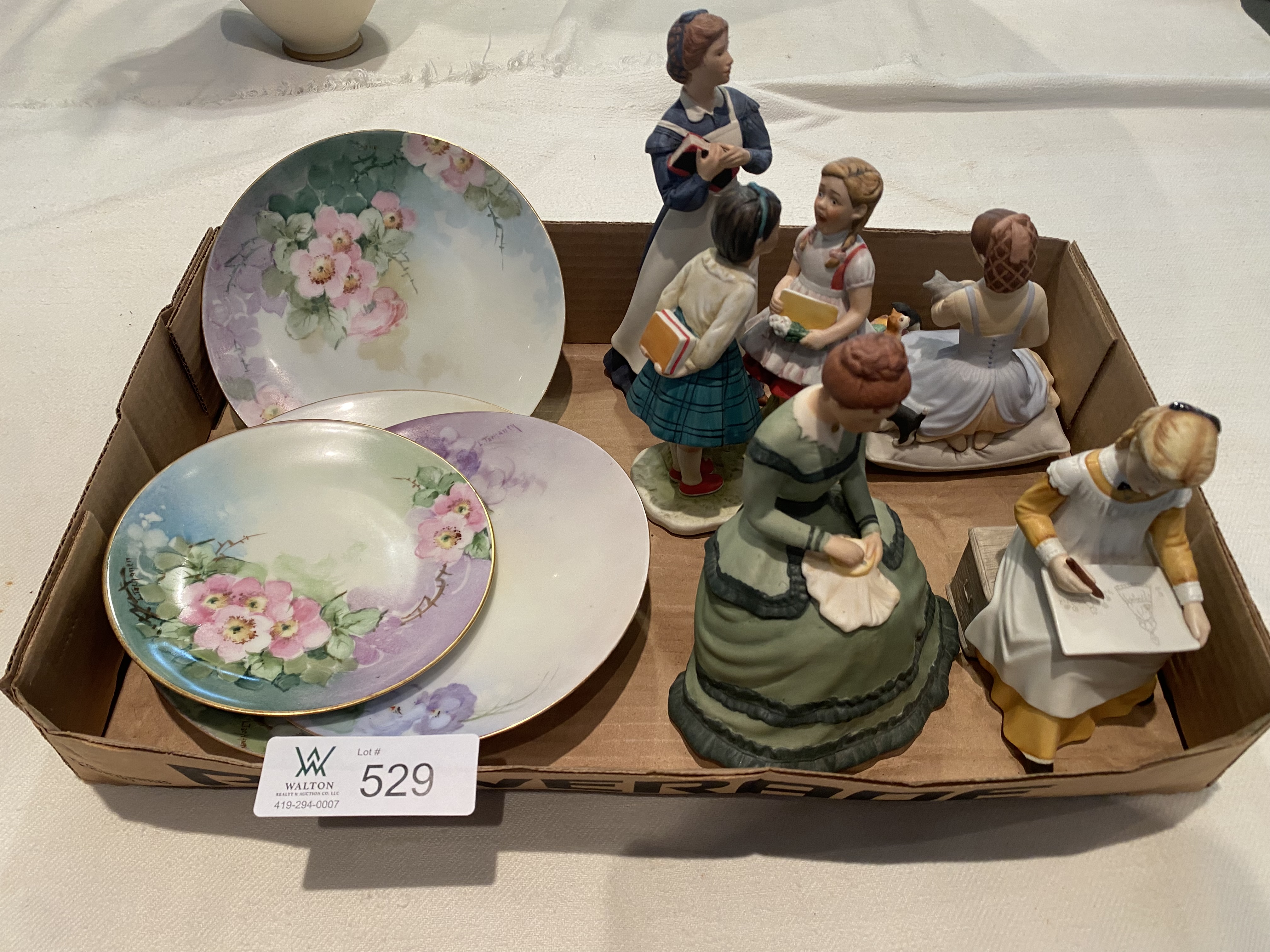 figurines; pewter; Royal Dalton pitcher; celluloid dresser set; plates;