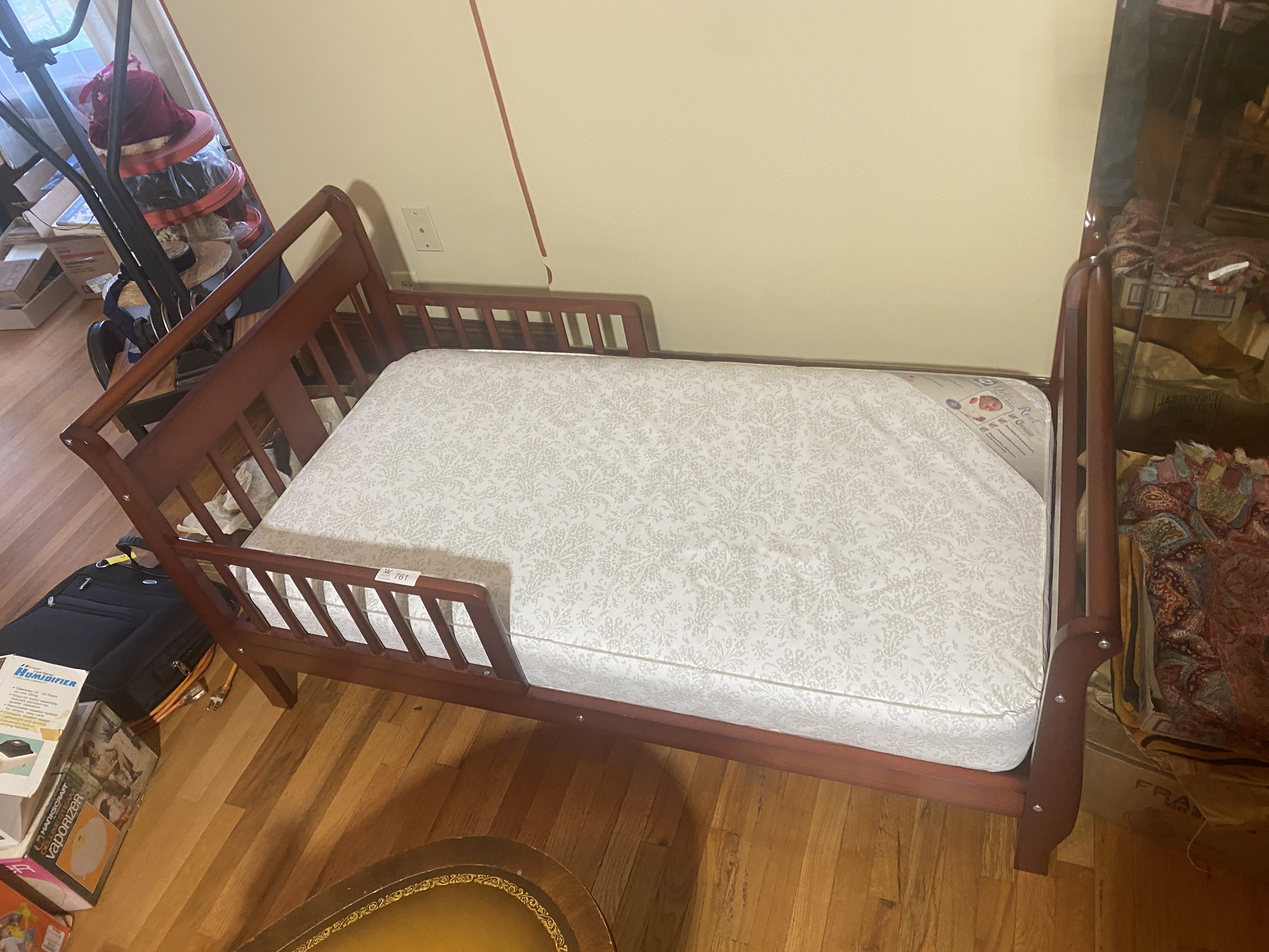 needlepoint seat clawfoot chair; beveled glass mirrors 48”x12”; child’s bed