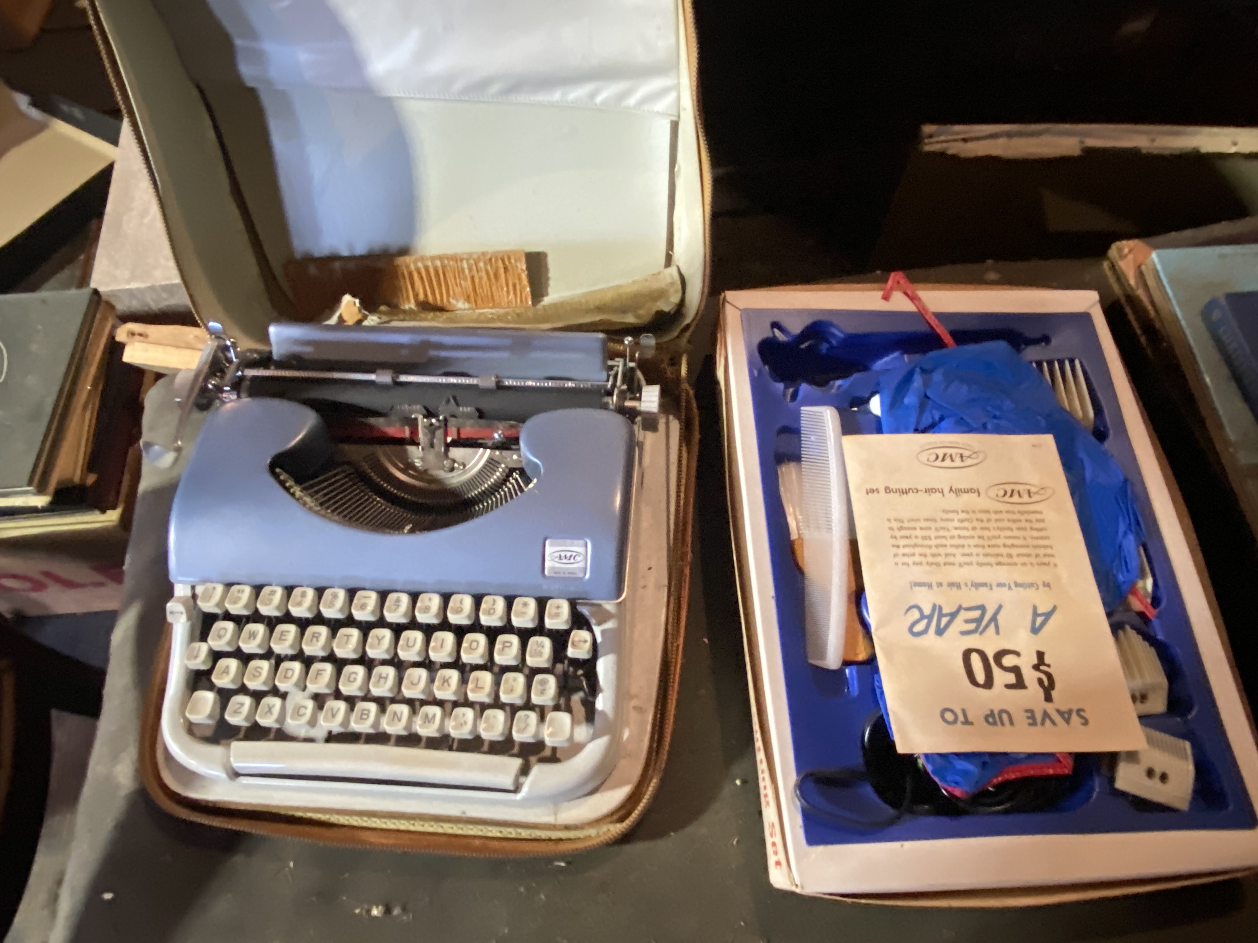 couch; Victor talking machine w/box of records; wicker stool and loom; sewing