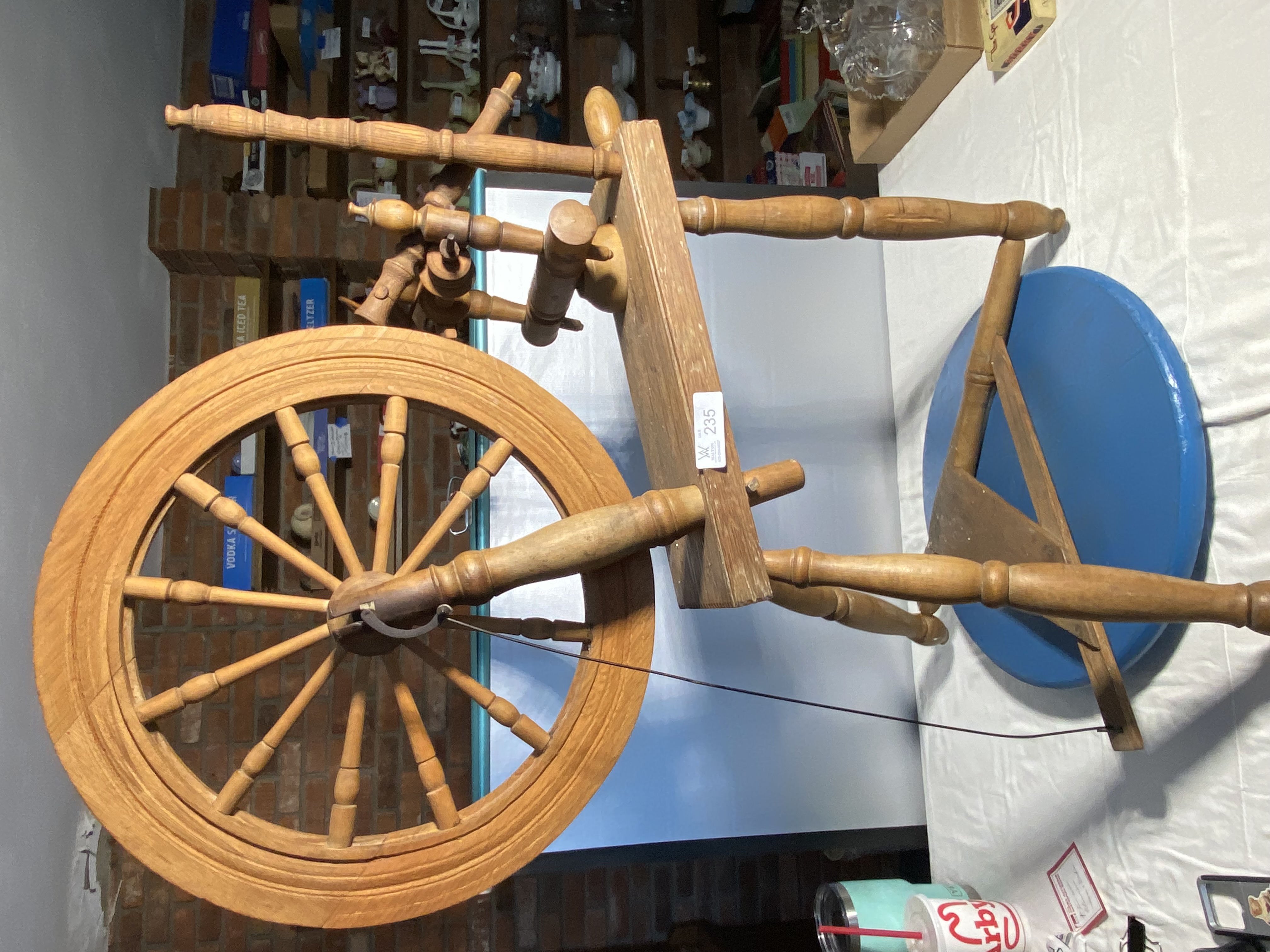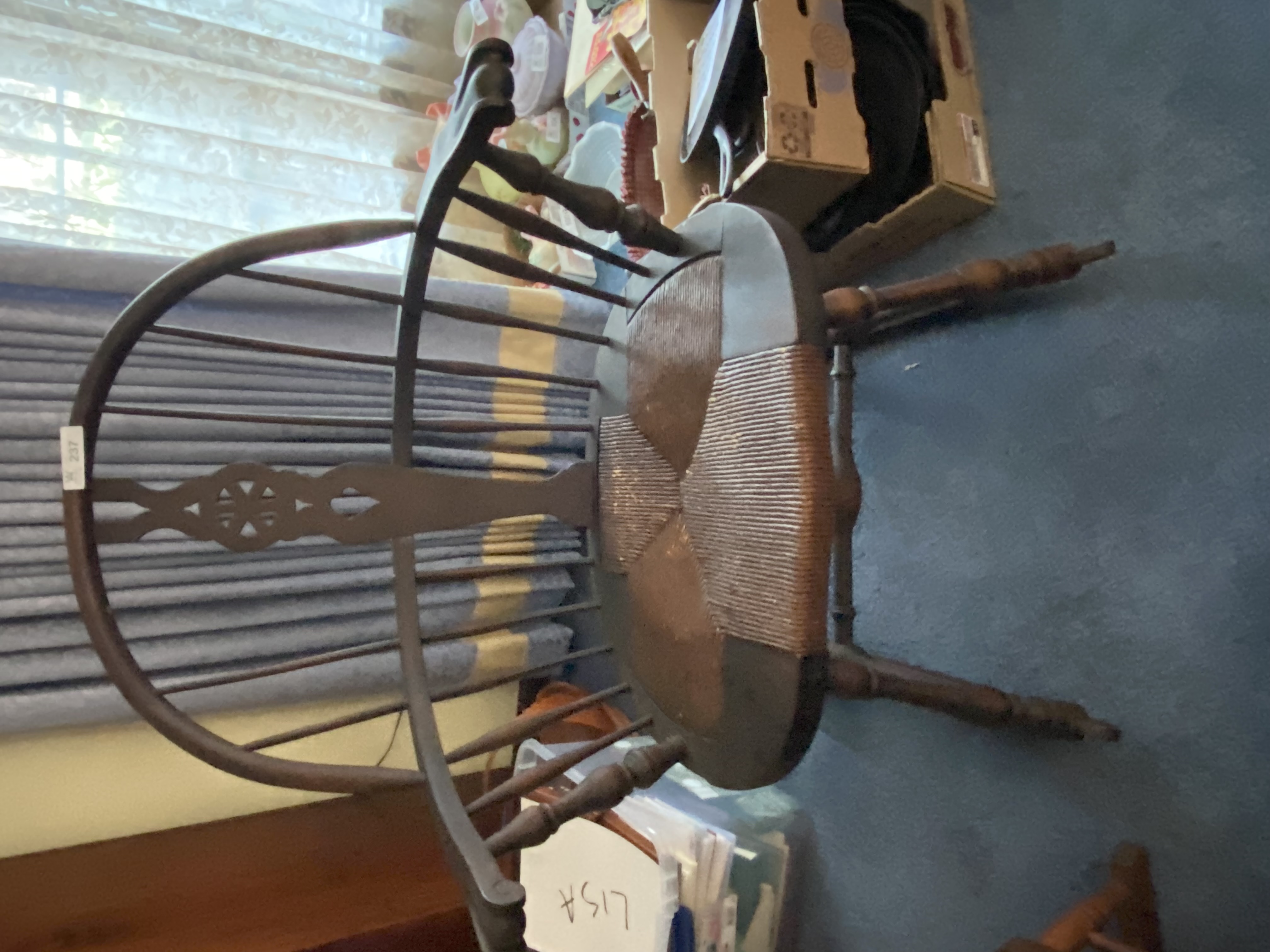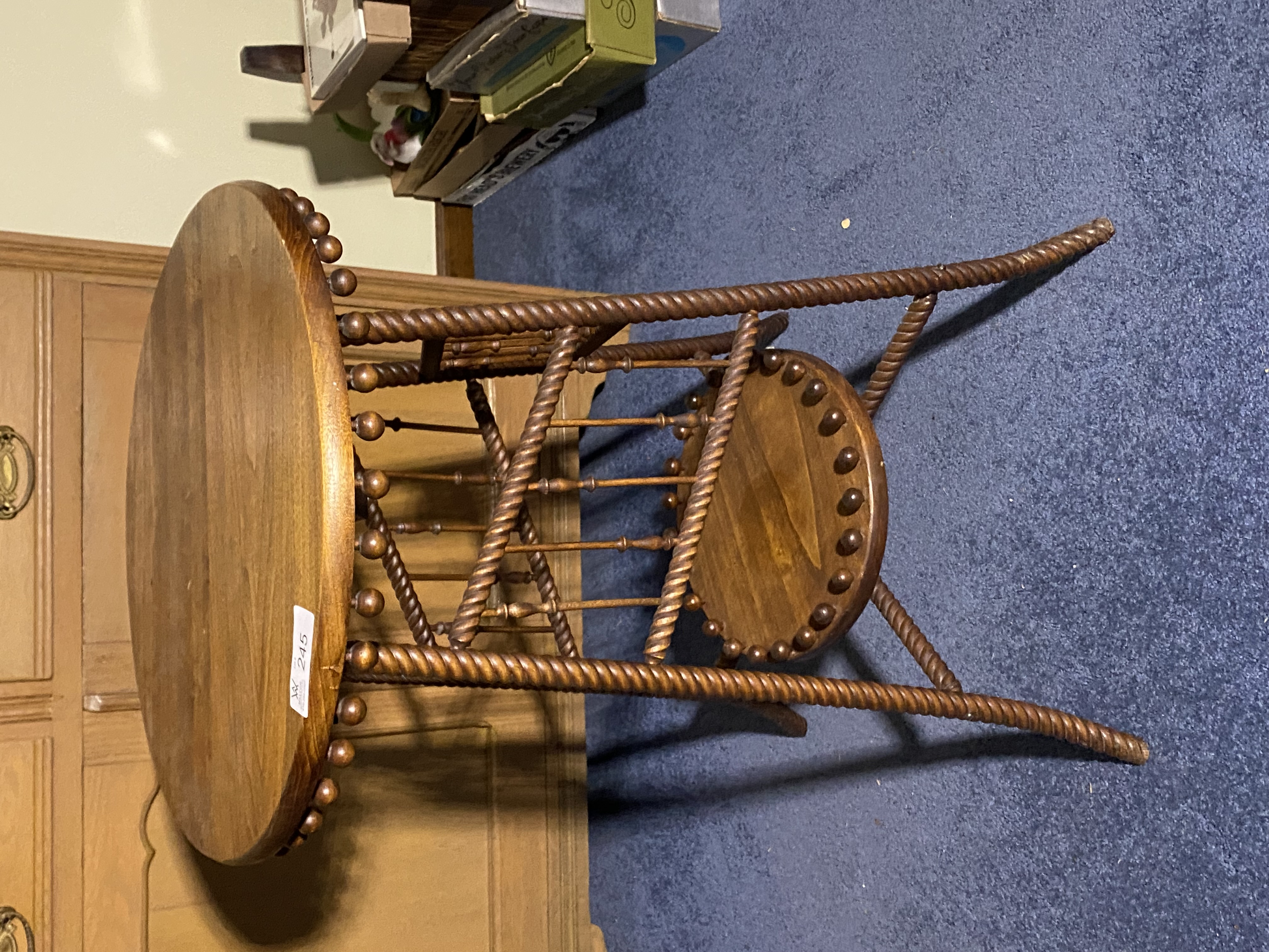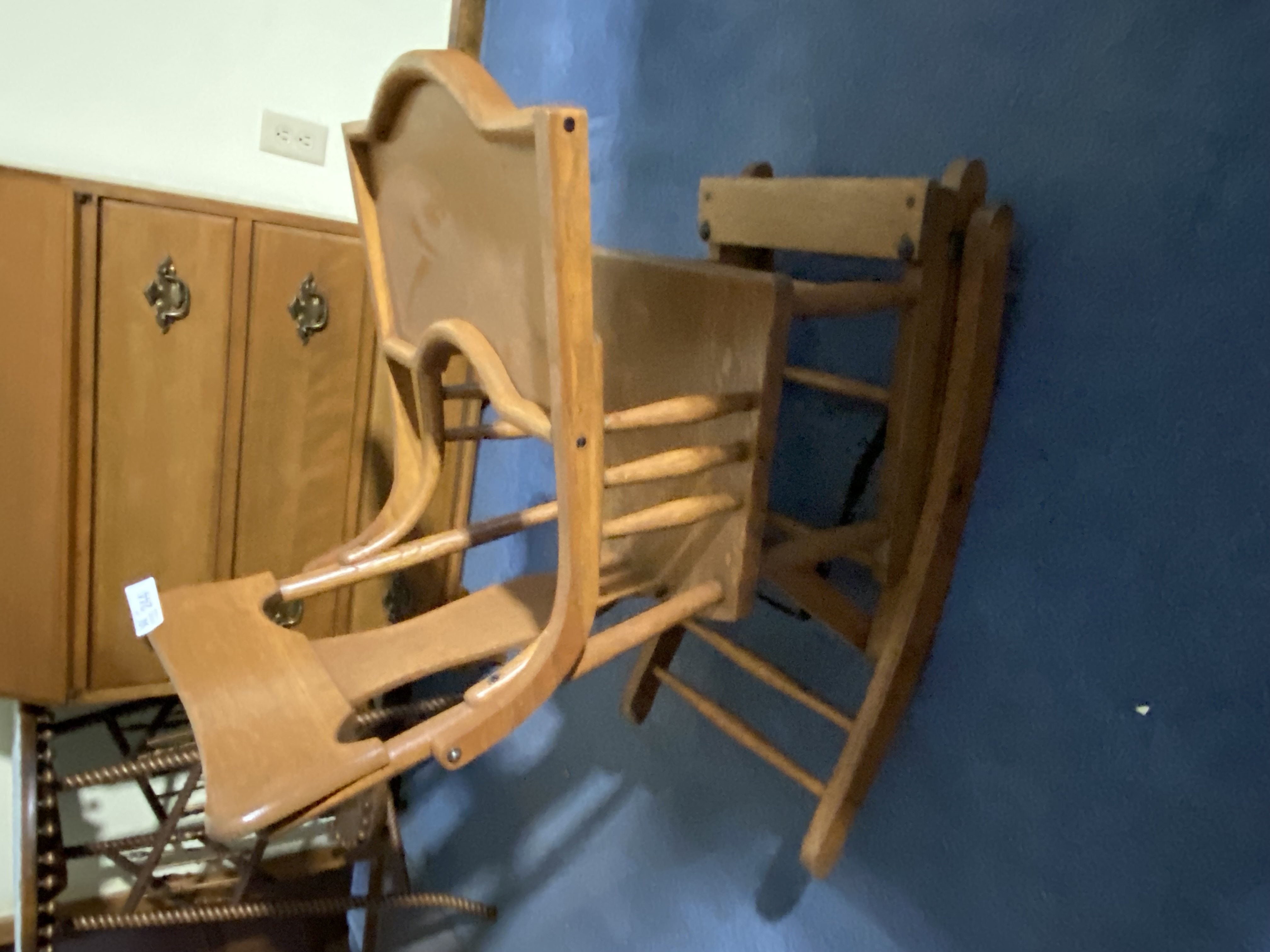 child oak T-back High chair/ rocker w/ wood tray; spinning wheel; unusual round