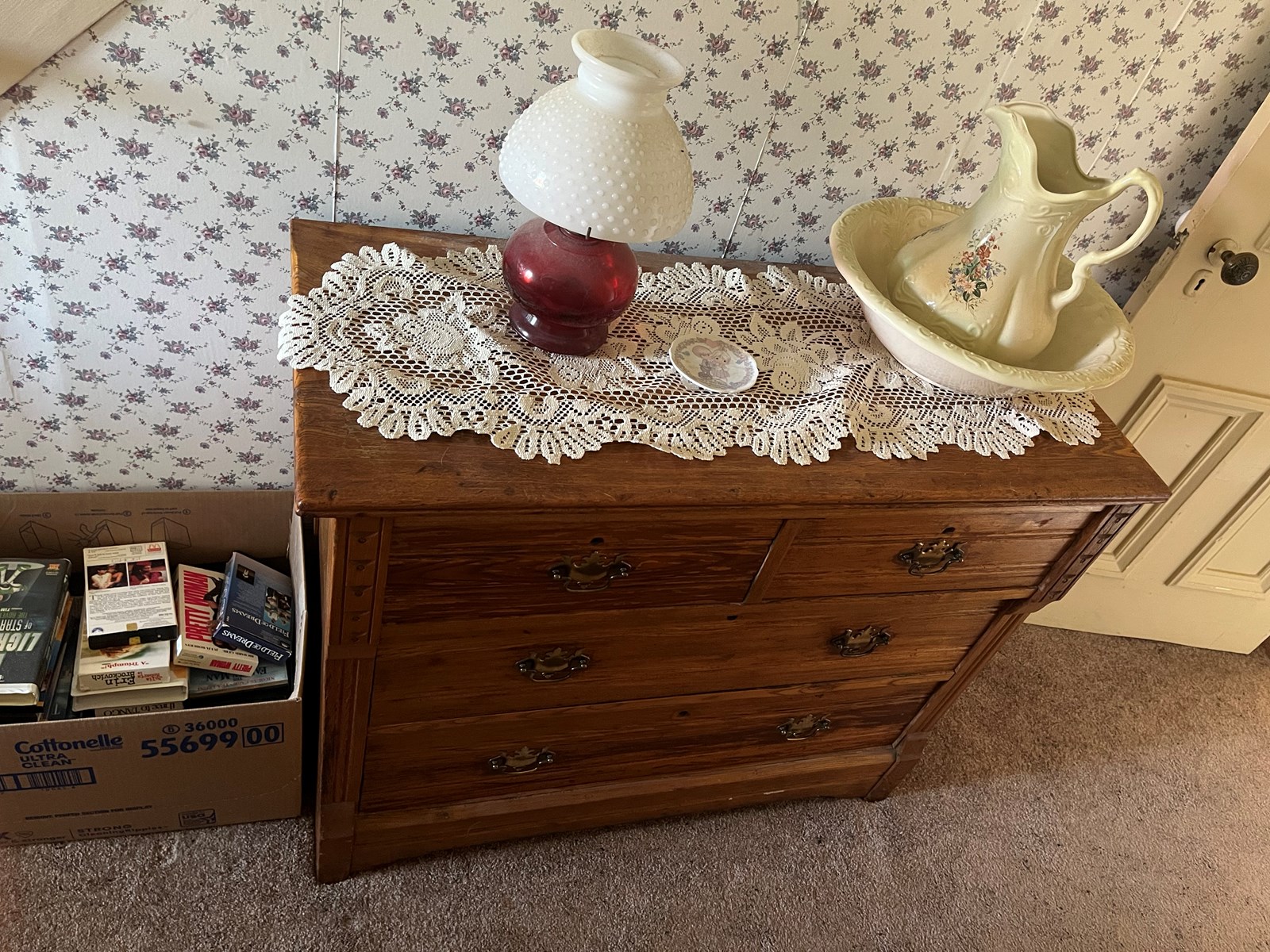 Broyhill chest of drawer; flat trunk; wd. table w/ paw feet; spindle back rocker; wash board; (2) glider rockers,(1) w/ ottoman; humpback trunk; child’s spindle back rocker; OAK: tall cabinet, trash receptacle, md. S roll top desk, Microwave stand, center pedestal table w/ 6 heavy duty chairs, chifforobe, file cabinet, boot chest; craft bench; craft baskets; assort crafts; oak veneer mag. rack; parlor stand; sm. pine chest of drawers; sm. iron skillet; hat rack; dresser; pic. & frames include. rural; mantal clock; typewriter; chandeliers; pressed glass; Pfaltzgraff dishes; wheat pattern China; pedestal rm. heater; lamps; old child highchair; quilt rack; knee hole desk; country collectables; Emerson flat screen TV; beige sofa; occasional chairs; pine wardrobe; ceder chest; White sewing machine; LG front load washer & dryer; Rotator vac; canister set; utensils; crock; baby beds;